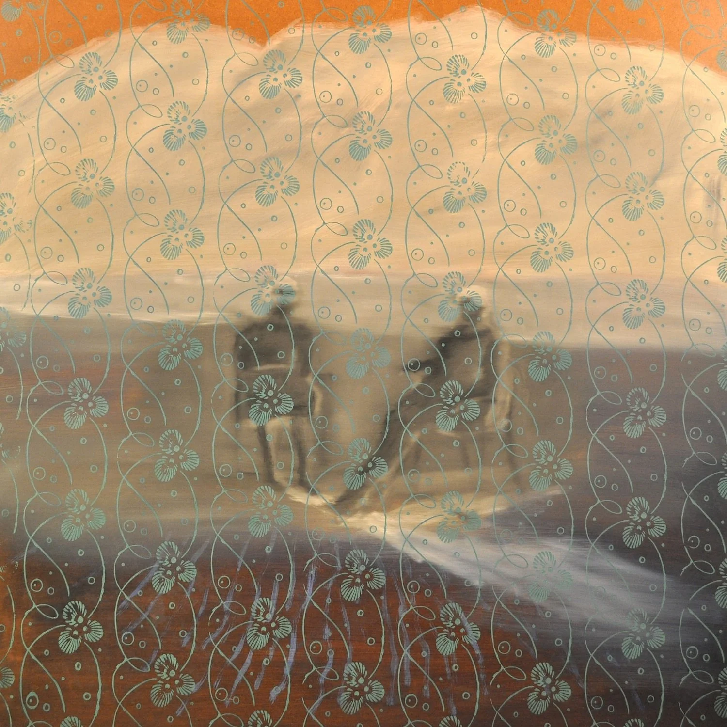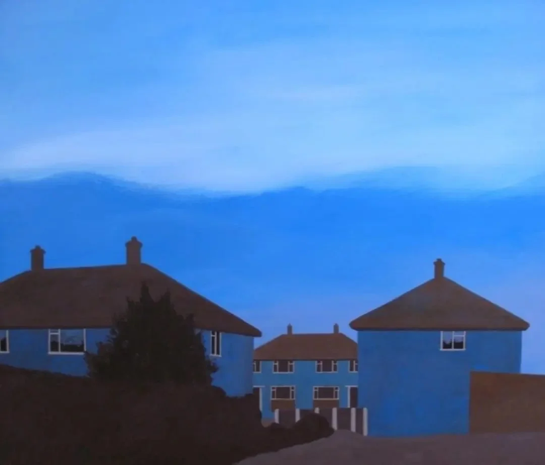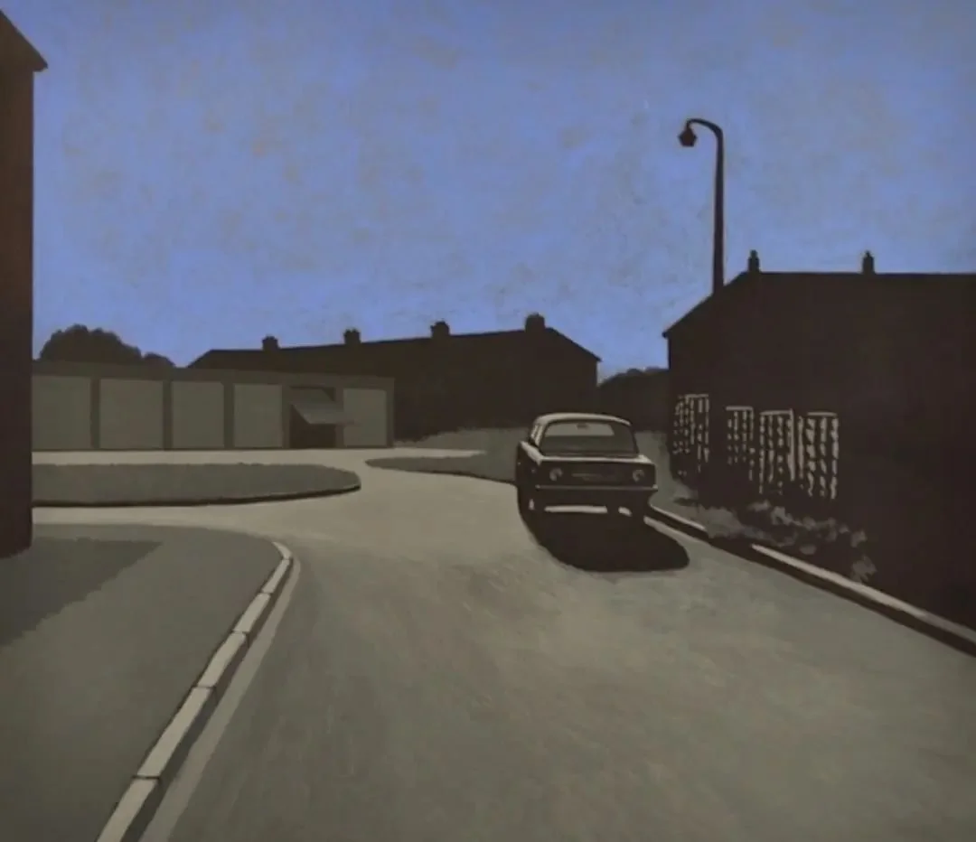 David’s later paintings of suburban landscapes with the parked cars and privet hedges extended and refined the earlier works. The hallucinatory qualities remain but the colours have become more restrained and selective. The blues though have a deep intensity drawing the viewer into a shared visual subtext; invisible crocodiles could be hiding in the bushes furtively waiting for a passerby. The glazes function for me like a barrier between perception and the painting subject matter, simultaneously separating and connecting personal subjectivity with image subjectivity; another great way David finds to generate tension and resolution. He achieves a similar effect with the wallpaper overlays, meditative compositions resembling the experience of mindful periods being interrupted by spontaneous memories and triggered thoughts.